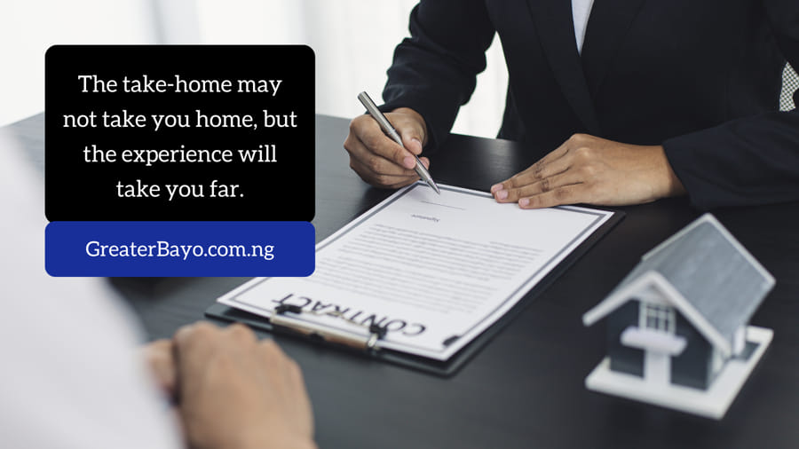 Every experience, no matter how small, shapes your future. Share on XSo don’t be discouraged. Work hard at whatever you’re doing at the moment. Give it your best shot. The take-home may not actually take you home, but go for the experience. Give value and be outstanding.
